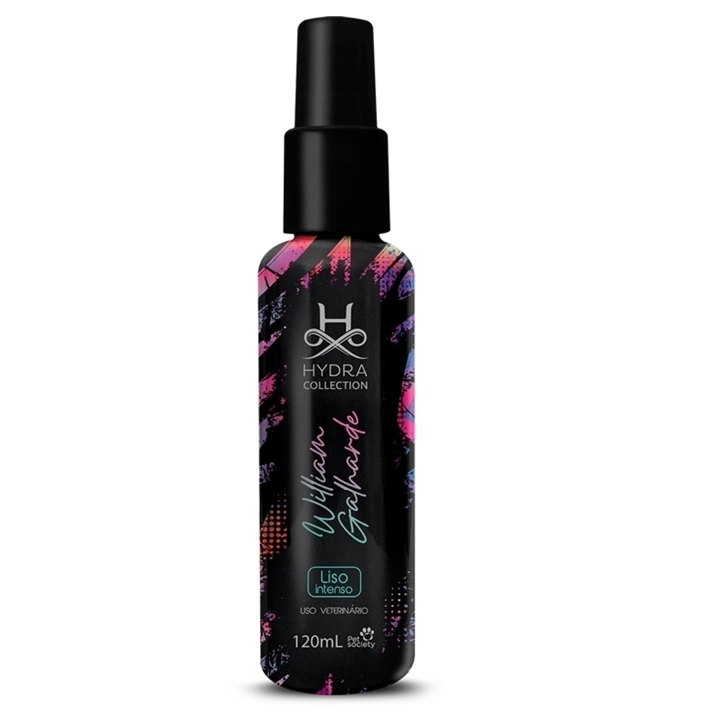 Uso tópico. Borrife o Hydra Collection William Galharde Spray Liso Intenso sobre a pelagem úmida, aplicando nas áreas onde deseja mais alinhamento e redução de frizz. Proceda com a secagem para potencializar o efeito liso.
